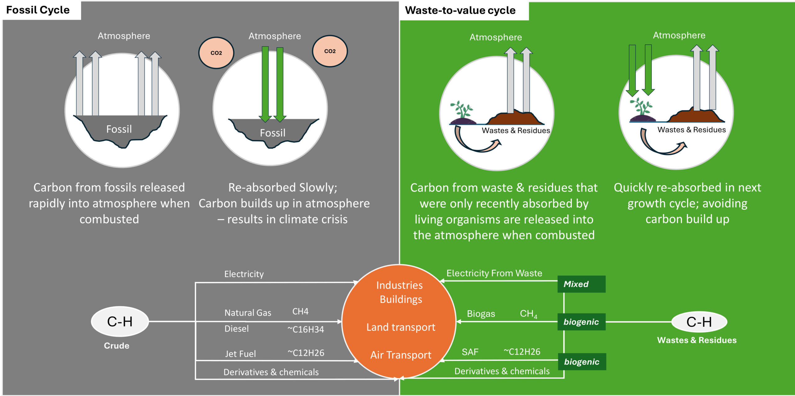 Both fossil fuels and waste-derived fuels emit Co2 when combusted; but the latter recycles the carbon quickly, thus preventing buildup in the atmosphere that causes climate crisis.